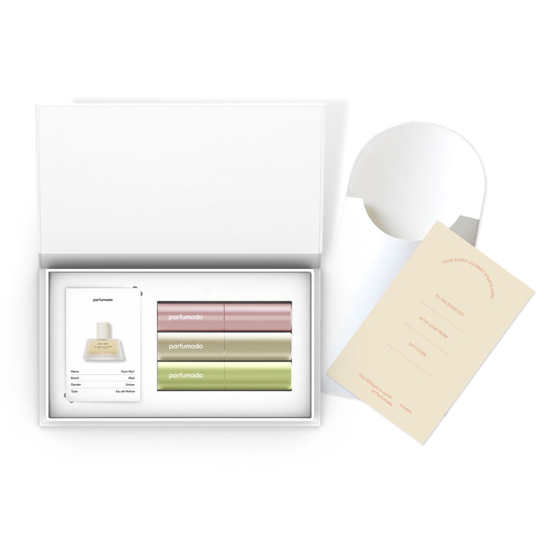 Parfumontdekkingsplatform. In de giftset zitten drie unieke parfums: Abel Cyan Nori (fris-zilt en fruitig), M. Micallef Hypnotic Musk (warm, fluweelzacht en licht zoet) en Stellair Skin + Wood (romig, houtachtig en zacht)